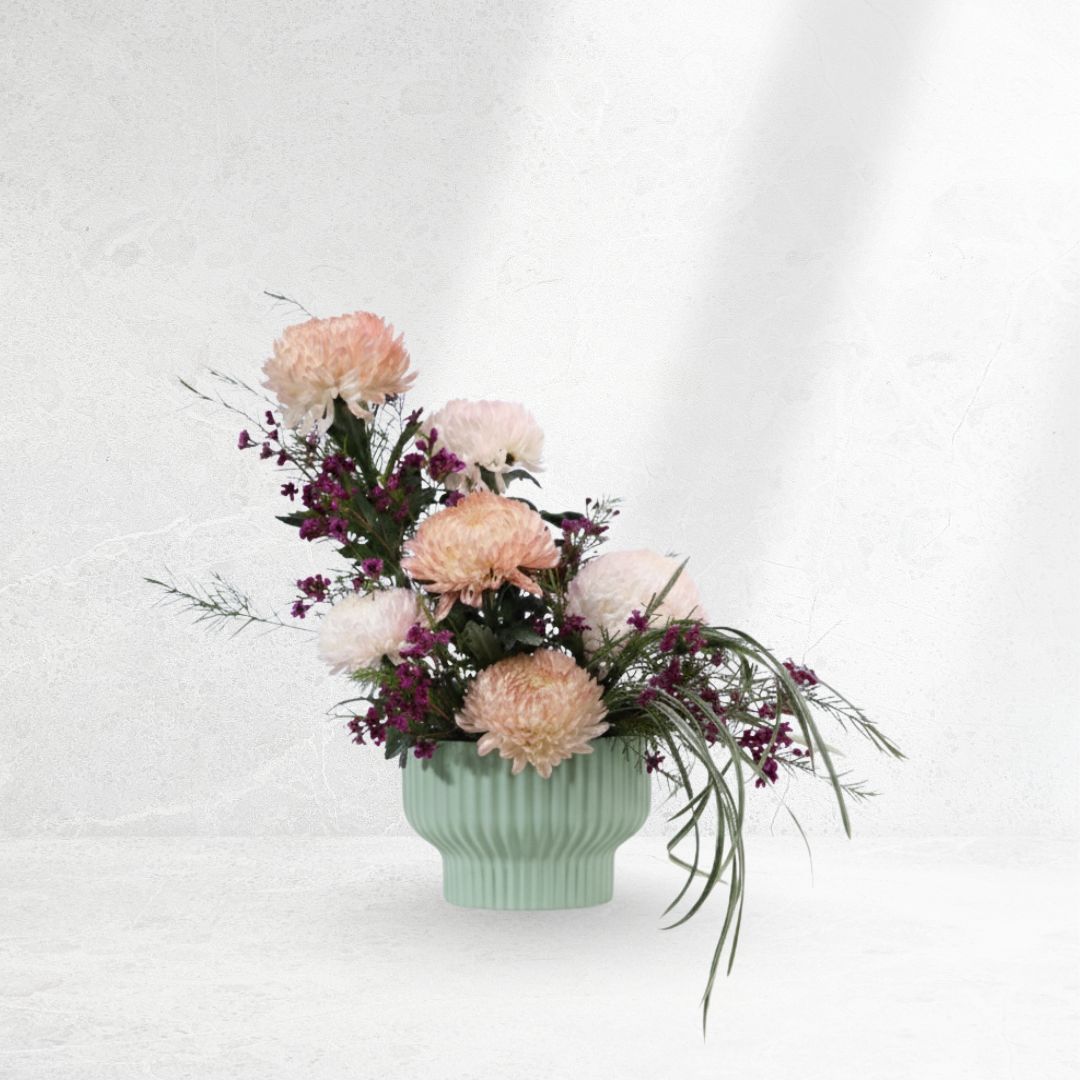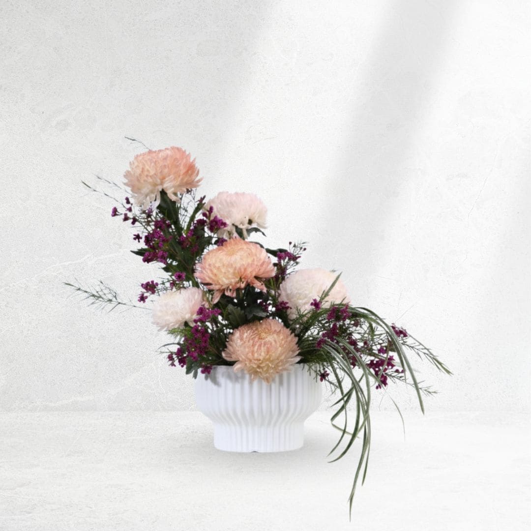 🌿A graceful blend of Snowdown Light chrysanthemums, white China grass, and purple wax flowers, the Elegance Mum Arrangement adds a refined, soft charm to any space.
