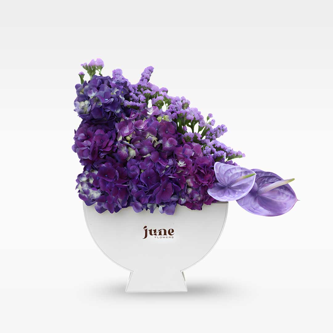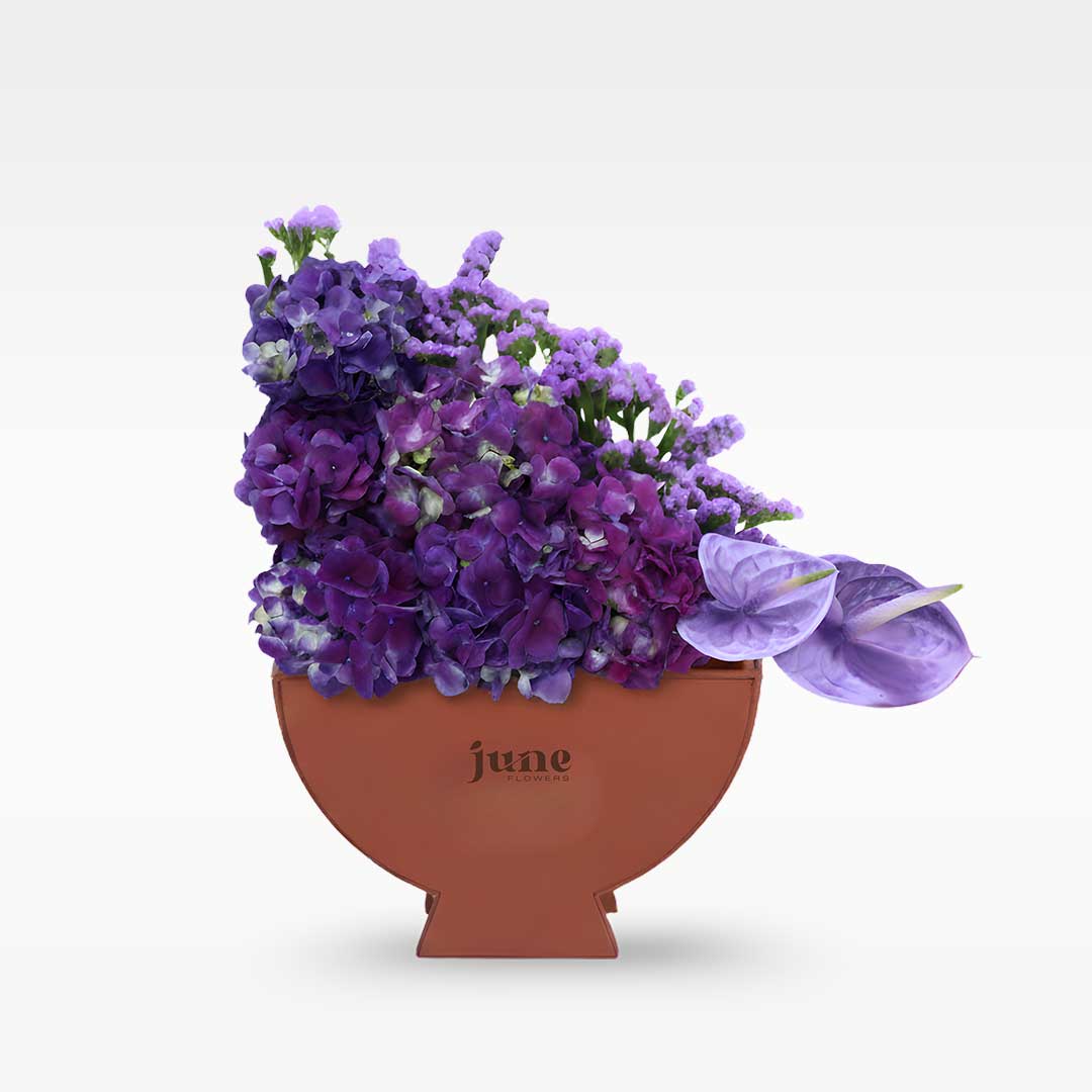 A rich mix of Purple Hydrangea 💜, dyed Purple Anthurium 🌸, and bold purple Statice 🌿 — creating a deep, elegant arrangement full of texture and royal charm.