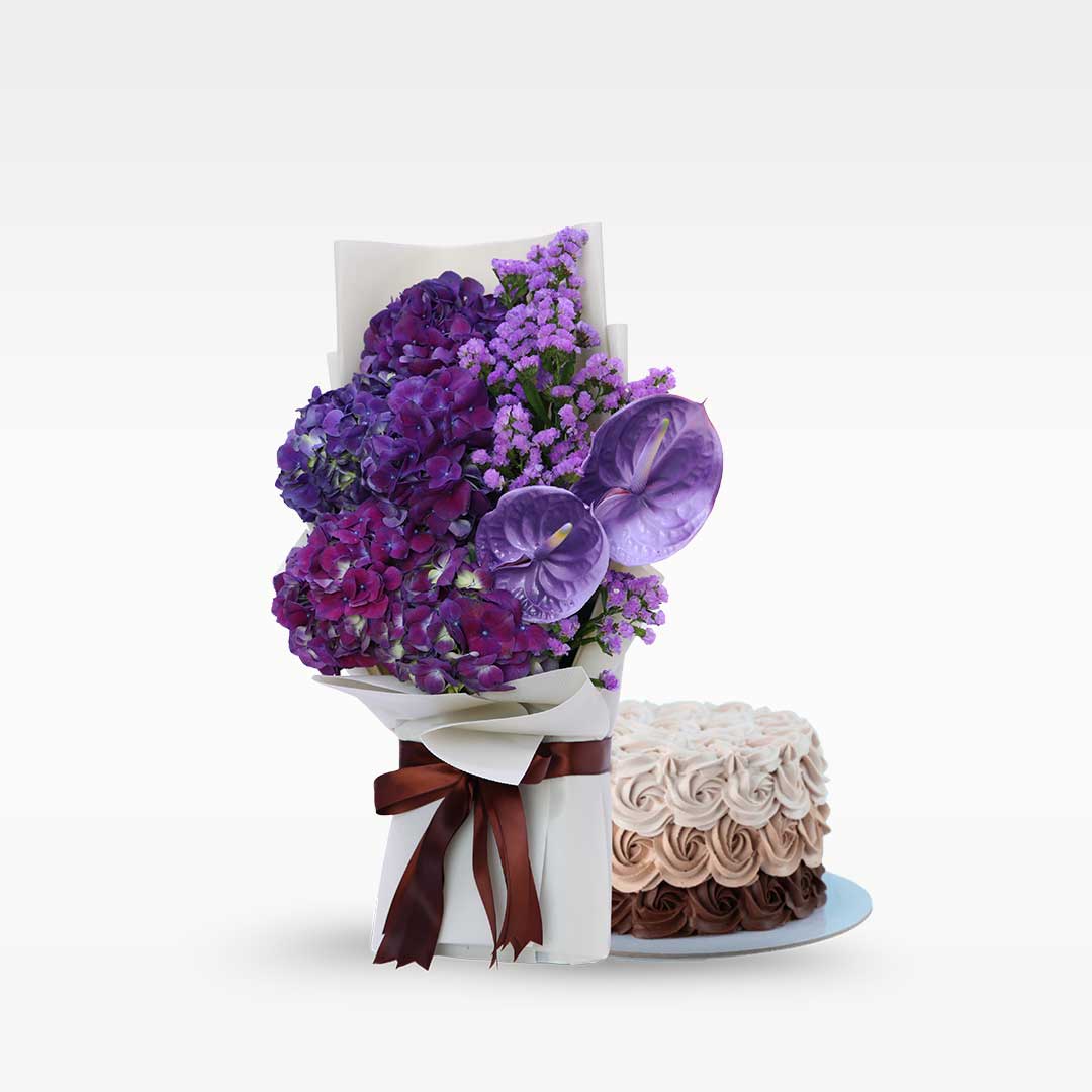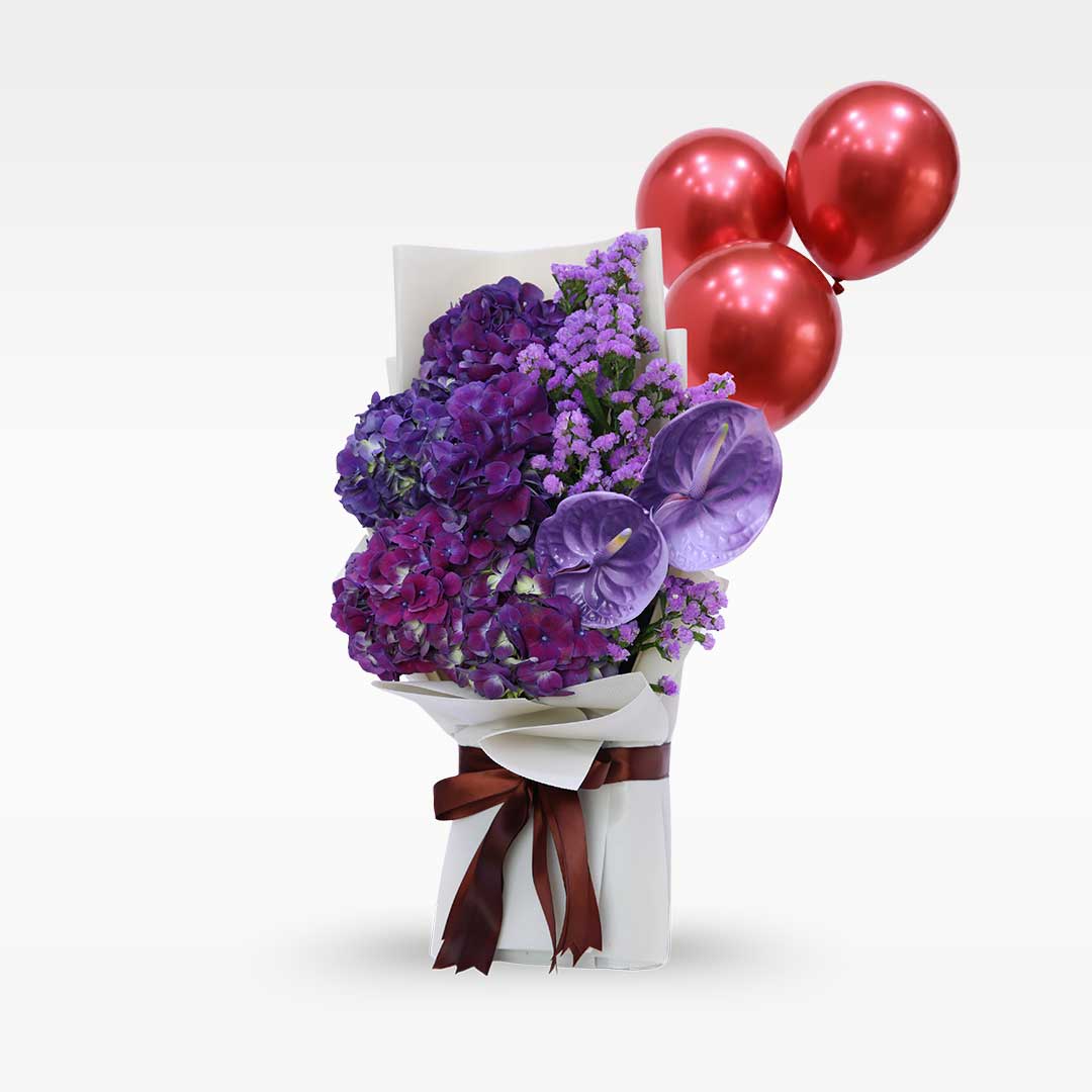A rich mix of Purple Hydrangea 💜, dyed Purple Anthurium 🌸, and bold purple Statice 🌿 — creating a deep, elegant arrangement full of texture and royal charm.