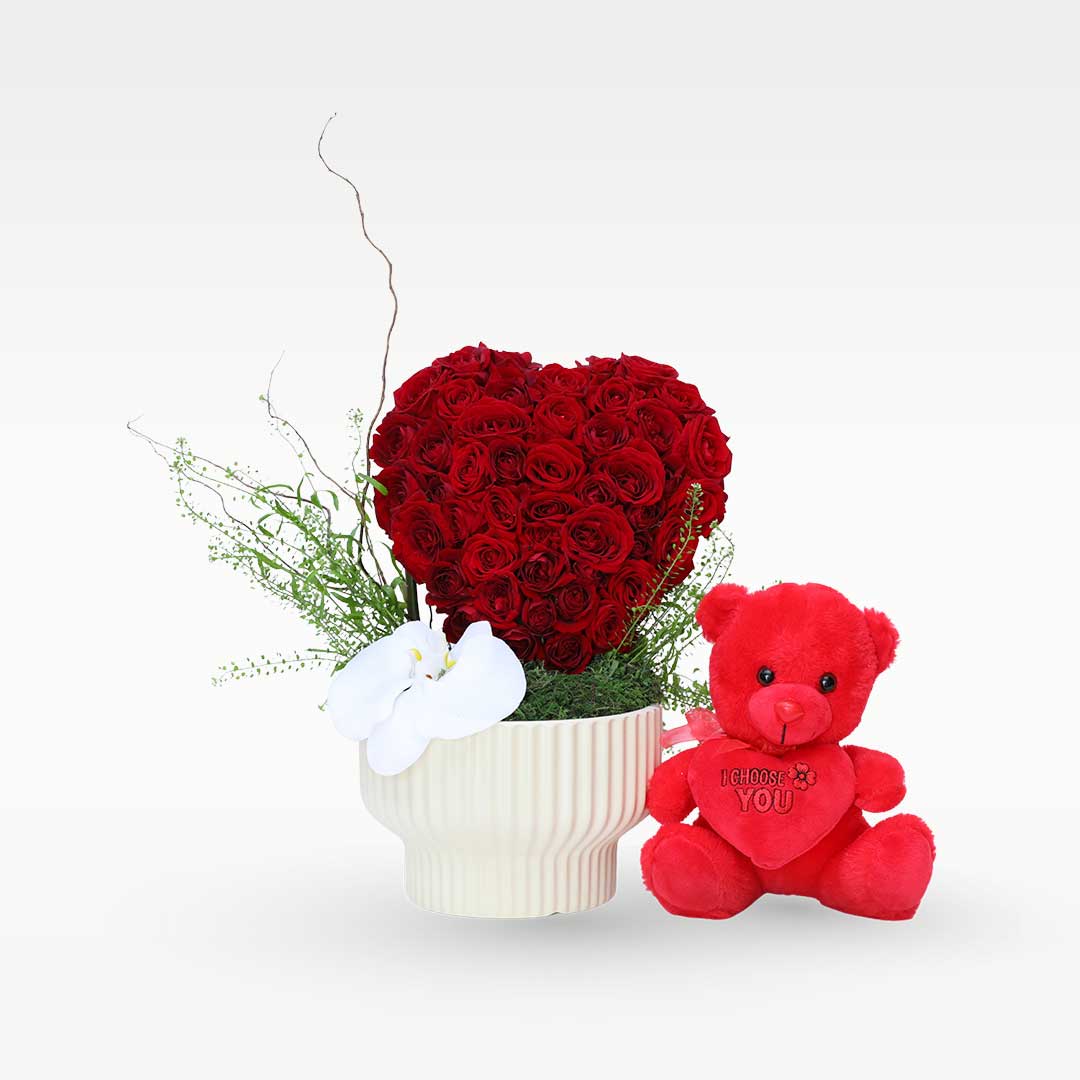 🌹 Red roses paired with 🧸 a cuddly teddy in an elegant pot — expressing 💞 sweet affection and ❤️ heartfelt Valentine love.