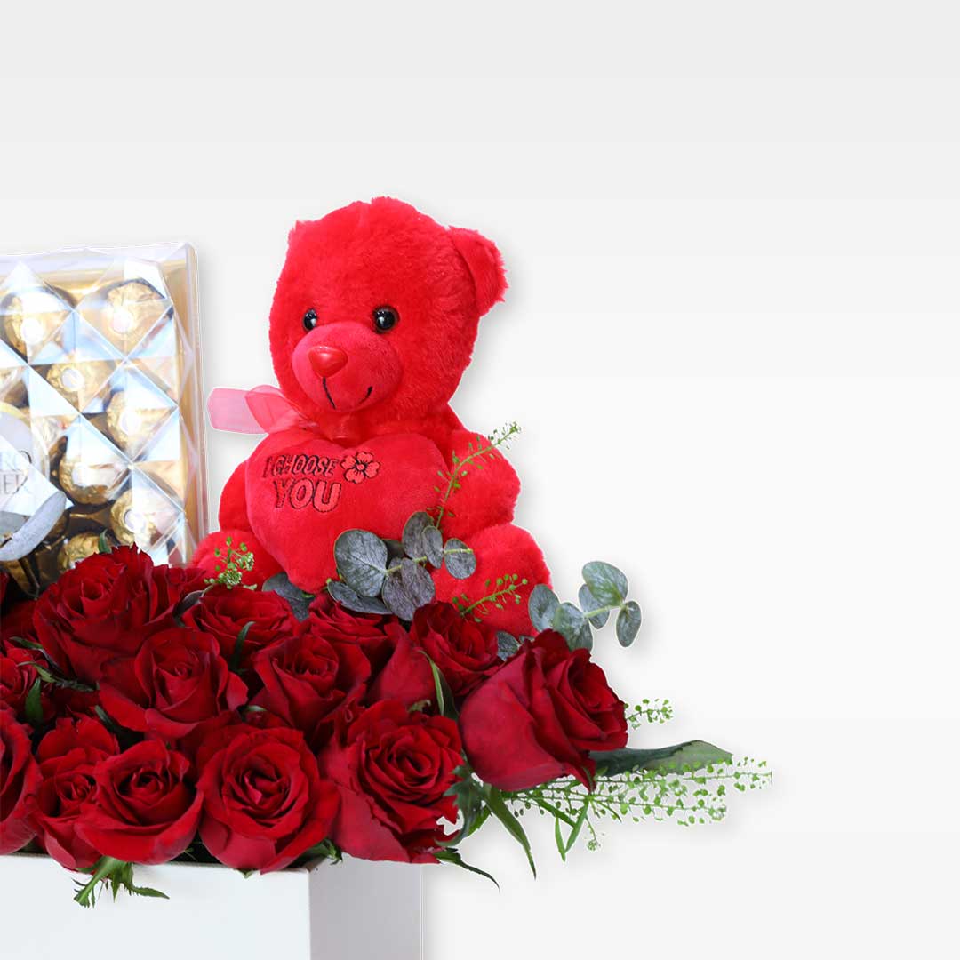 🌹 A lavish arrangement of red roses paired with 🍫 Ferrero Rocher and 🧸 a cuddly teddy in a signature box — celebrating ❤️ grand love and 💞 unforgettable Valentine moments.