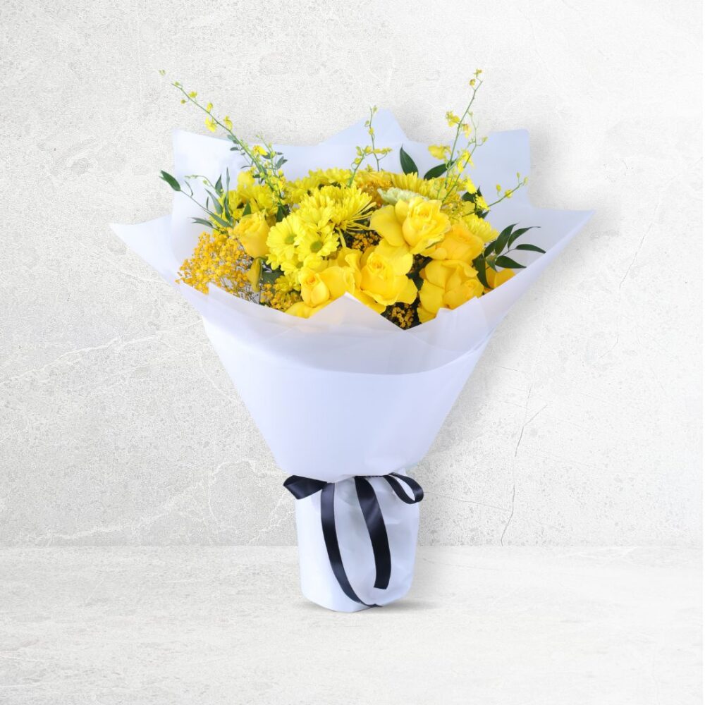 This product consist 5 Stems – Oncidium, 5 Stems Rose, 5 Stems-Chrysanthemum , 5 Stems- Delistar , 3 Stems- Italian Ruscus , 10 Stems – Gypsophilla.
