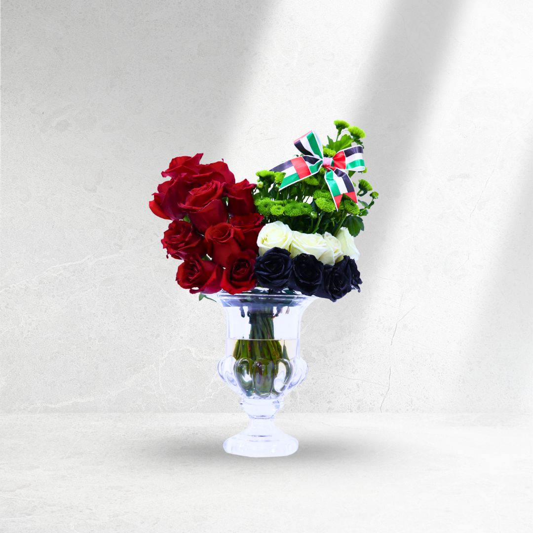 A striking UAE-themed arrangement featuring red roses ❤️, white roses 🤍, green button chrysanthemums 💚, and dramatic black roses 🖤 — beautifully styled to mirror the UAE flag 🇦🇪 with elegance and national pride.