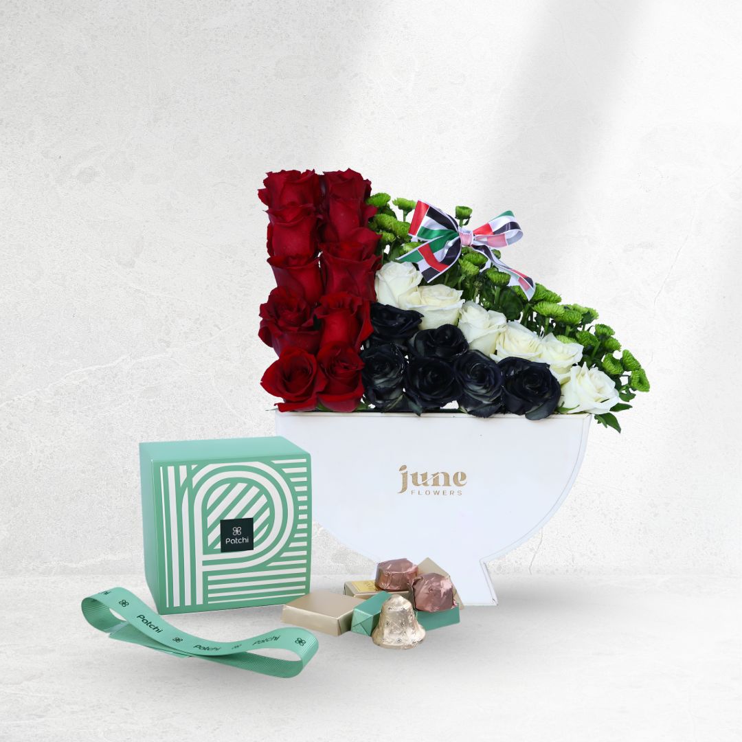 A bold celebration of UAE spirit with red roses ❤️, white roses 🤍, green button chrysanthemums 💚, and black roses 🖤, arranged in striking UAE flag colors 🇦🇪. Paired with a rich Chocolate Mousse Cake 🍰, it’s a perfect patriotic tribute.