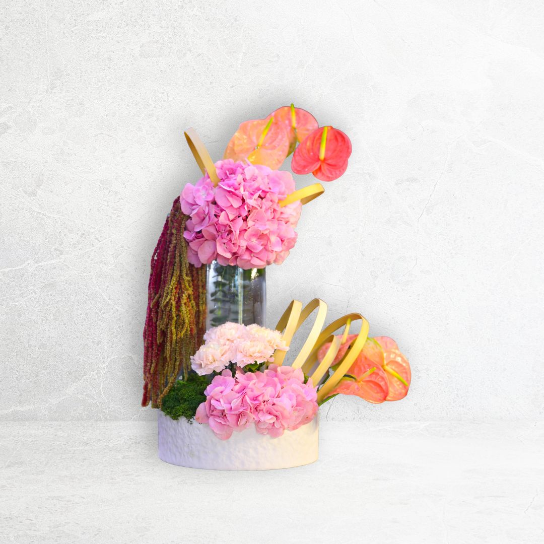 A dual-level story of pink hydrangeas and tropical anthuriums in an artful setup. Designed to captivate and elevate modern interiors.