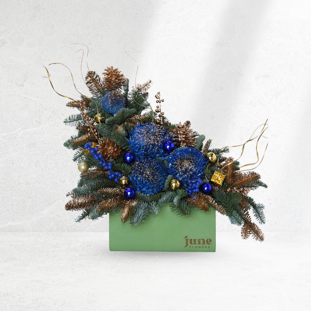 A luxurious holiday design featuring bold blue blooms, shimmering gold accents, pinecones, and lush evergreens — a rich blue-and-gold centerpiece that brings festive elegance to any space. 💙✨🎄