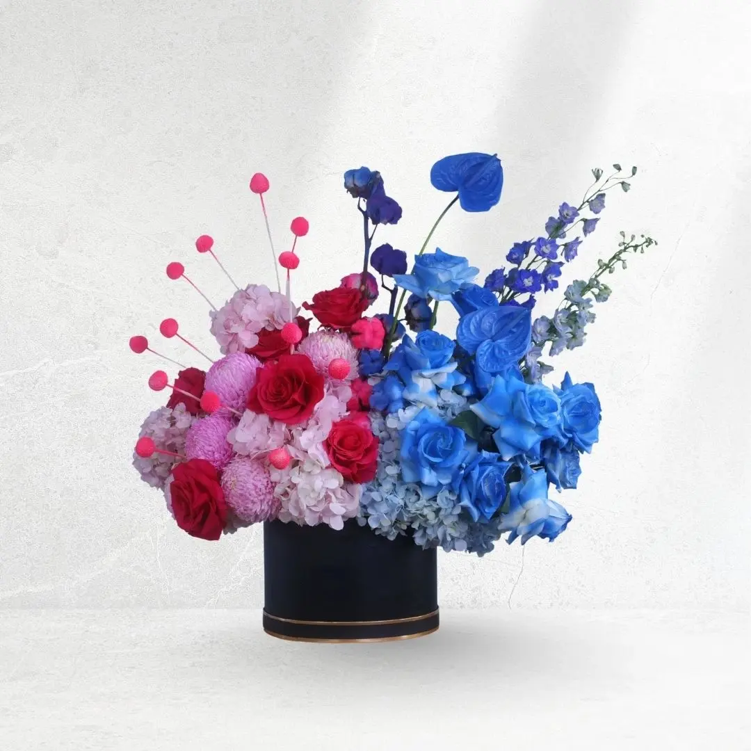 🔵🔴 A bold artistic mix of vibrant blue roses, red accents, and textured blooms 🎨. Designed to impress with contrast and modern flair.