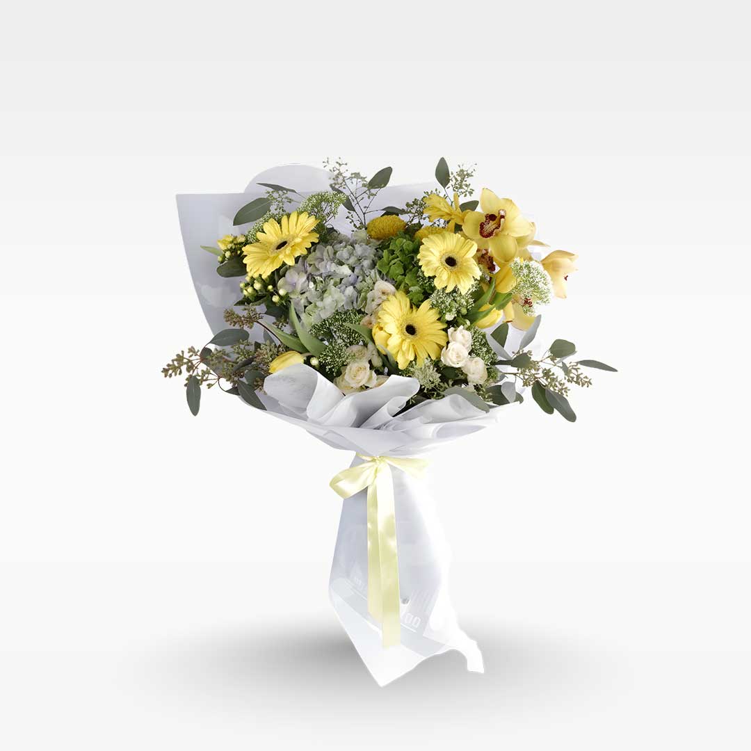🌼 A bright blend of yellow blooms and soft greens, wrapped elegantly to spread warmth and positivity.