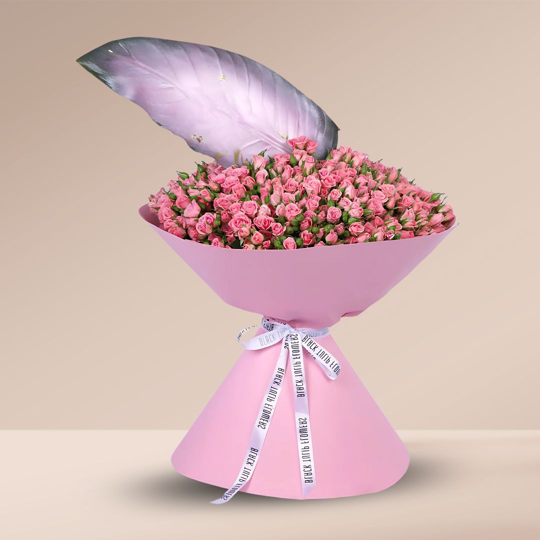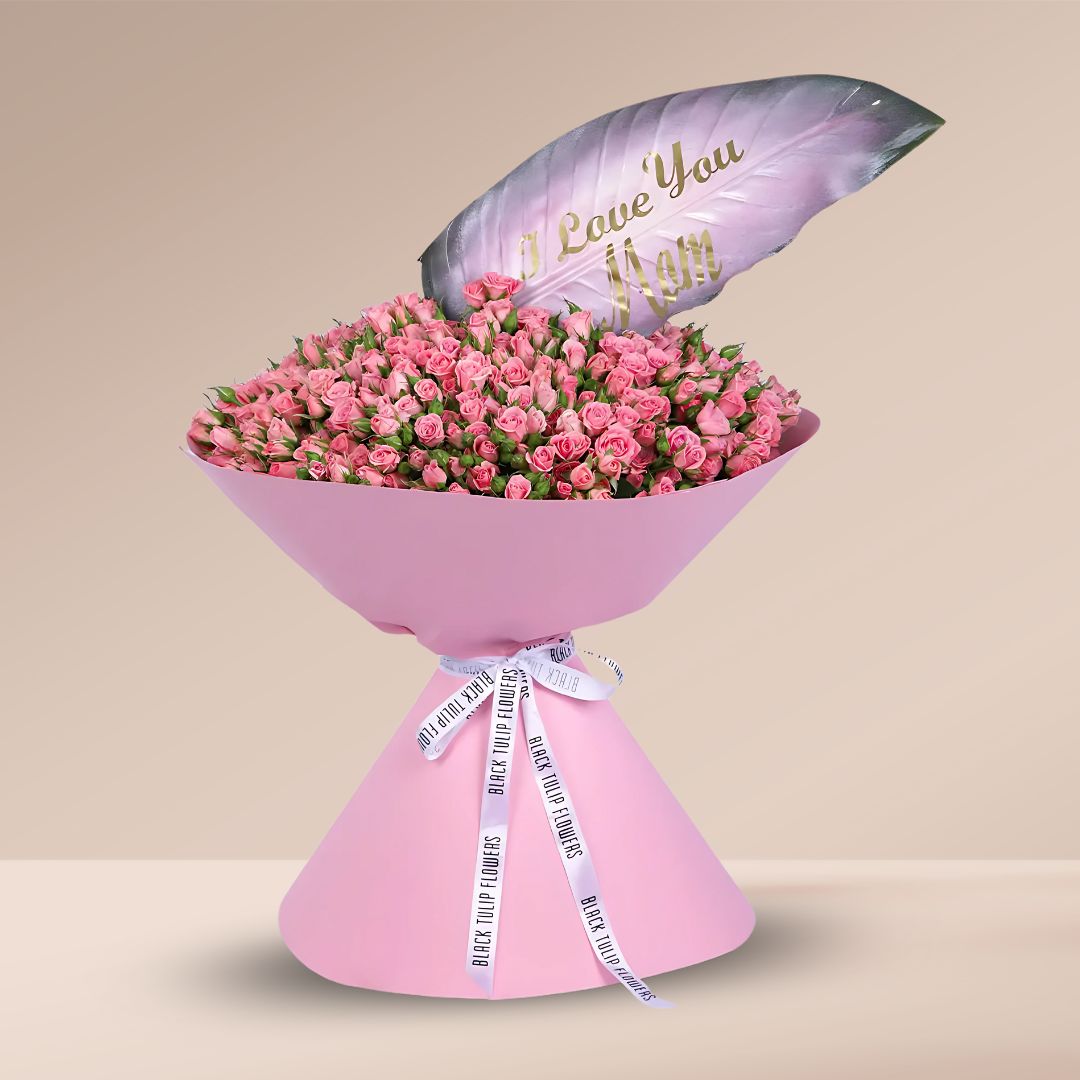 This bouquet consists of 100 stems Pink Spray Rose and sprayed BOP Leaf with “I Love You MOM” sticker.