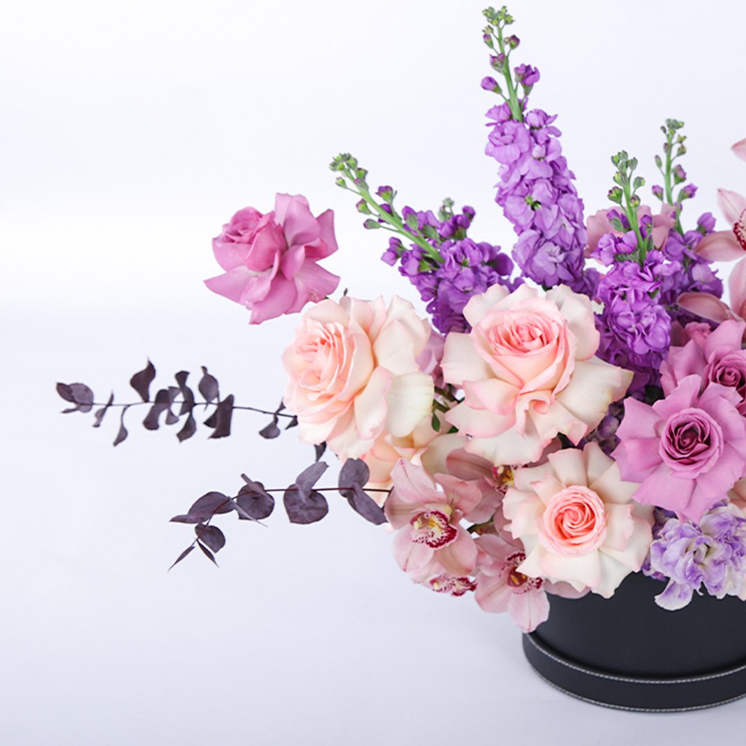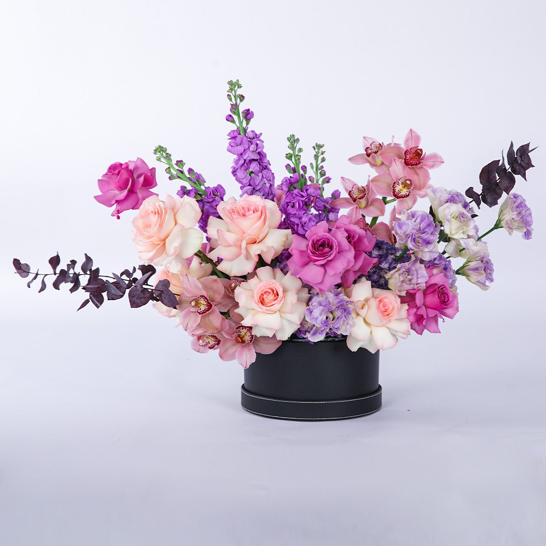 This product of 10 stem rose,5 stem Matthiola, 5 stem lisianthus, 1 stem cymbidium, and greens in a box